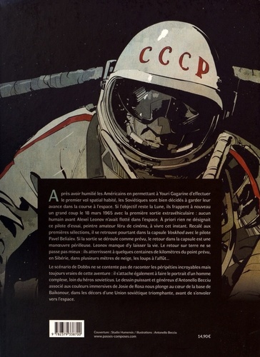Après avoir humilié les Américains en permettant à Youri Gagarine d'effectuer le premier vol spatial habité, les Soviétiques sont bien décidés à garder leur 4 avance dans la course à l'espace. Si l'objectif reste la Lune, ils frappent à nouveau un grand coup le 18 mars 1965 avec la première sortie extravéhiculaire : aucun /, humain avant Alexeï Leonov n'avait flotté dans l'espace. A priori rien ne désignait ` ce pilote d'essai, peintre amateur féru de cinéma, à vivre cet instant. Recalé aux premières sélections, il se retrouve pourtant dans la capsule Voskhod avec le pilote Pavel Beliáiev. Si la sortie se déroule comme prévu, le retour dans la capsule est une manoeuvre périlleuse. Leonov manque d'y laisser la vie. Le retour sur terre ne se passe pas mieux : ils atterrissent à quelques centaines de kilomètres du point prévu, en Sibérie, dans plusieurs mètres de neige, les loups à l'affût... Le scénario de Dobbs ne se contente pas de raconter les péripéties incroyables mais toujours vraies de cette aventure : il s'attache également à faire le portrait d'un homme complexe, loin du héros sovieticus. Le dessin puissant et généreux d'Antonello Becciu associé aux couleurs immersives de Josie de Rosa nous plonge au coeur de la base de Baïkonour, dans les décors d'une Union soviétique triomphante, avant de s'envoler vers l'espace.