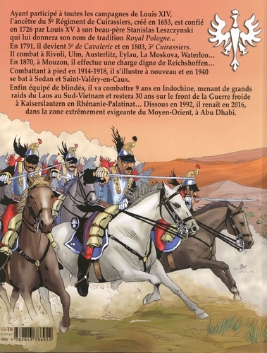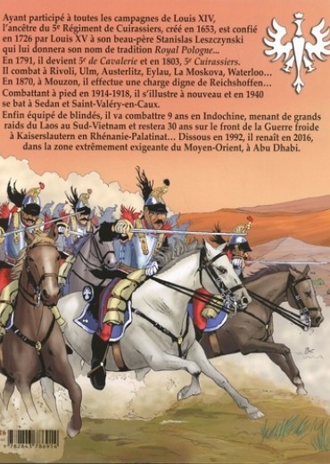 Ayant participé à toutes les campagnes de Louis XIV, l'ancêtre du 5e Régiment de Cuirassiers, créé en 1653, est confié en 1726 par Louis XV à son beau-père Stanislas Leszczynski qui lui donnera son nom de tradition Royal Pologne... En 1791, il devient 5e de Cavalerie et en 1803, 5e Cuirassiers. Il combat à Rivoli, Ulm, Austerlitz, Eylau, La Moskova, Waterloo... En 1870, à Mouzon, il effectue une charge digne de Reichshoffen... Combattant à pied en 1914-1918, il s'illustre à nouveau et en 1940 se bat à Sedan et Saint-Valéry-en-Caux. Enfin équipé de blindés, il va combattre 9 ans en Indochine, menant de grands raids du Laos au Sud-Vietnam et restera 30 ans sur le front de la Guerre froide à Kaiserslautern en Rhénanie-Palatinat... Dissous en 1992, il renaît en 2016, dans la zone extrêmement exigeante du Moyen-Orient, à Abu Dhabi.