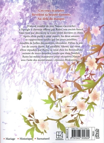 Ces yeux écarlates révèlent sa beauté damnée, au-delà du masque. D'abord troublé de voir Nanao s'accrocher à l'épingle à cheveux offerte par Reito, son ancien fiancé, Yakô finit par découvrir la triste vérité derrière ce choix. Après s'être parlé à coeur ouvert, les deux amants se rapprochent tandis que les jours paisibles, émaillés de belles découvertes, s'écoulent. Hélas, la joie est de courte durée. En parallèle, Akemi, qui vient d'être répudiée par Reito, se rend chez les Benitsubaki animée de noirs desseins, tandis que dans l'ombre, Reito lui-même manoeuvre pour récupérer Nanao avec l'aide des mystérieuses "épouses Byakurenji"...