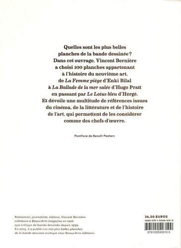 Quelles sont les plus belles planches de la bande dessinée ? Dans cet ouvrage, Vincent Bernière a choisi 100 planches appartenant à l'histoire du neuvième art, de La Femme piège d'Enki Bilal à La Ballade de la mer salée d'Hugo Pratt en passant par Le Lotus bleu d'Hergé. Et dévoile une multitude de références issues du cinéma, de la littérature et de l'histoire de l'art, qui permettent de les considérer comme des chefs-d'oeuvre.