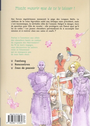 Partez à l'aventure aux côtés des chevaliers hauts en couleur du royaume des Marronniers ! Au fil de leurs voyages, vous découvrirez un univers riche et foisonnant qui ne manquera pas de vous faire rêver. Des forces mystérieuses menacent le pays des Longues Nuits. Le château de la reine Hyrrokkin subit une attaque sans précédent, mais c'est Insomniaque, la véritable cible de l'ennemi. Malgré le danger, hors de question pour Ellie de reculer : elle protégera son fiancé quoi qu'il lui en coûte ! Les jeunes chevaliers parviendront-ils à accomplir leur mission et à rentrer chez eux sains et saufs ?