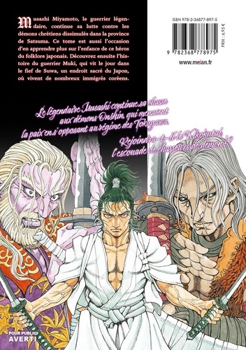 Musashi Miyamoto, le guerrier légendaire, continue sa lutte contre les démons chrétiens dissimulés dans la province de Satsuma. Ce tome est aussi l'occasion d'en apprendre plus sur l'enfance de ce héros du folklore japonais. Découvrez ensuite l'histoire du guerrier Muki, qui vit le jour dans le fief de Suwa, un endroit sacré du Japon, où vivent de nombreux immigrés coréens.