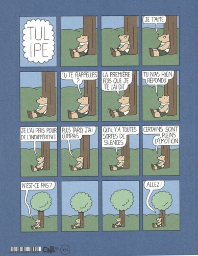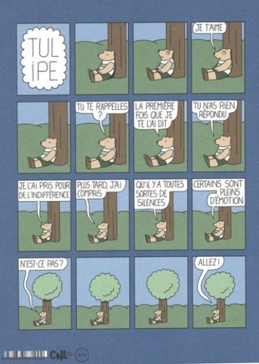 Qu'est-ce qui pourrait changer dans le petit monde de Tulipe ? Chaque élément semble être là de toute éternité, et pourtant tout bouge. Quelques personnages apparaissent, disparaissent, reviennent. Ceux que nous sommes habitués à voir continuent de s'agiter anxieusement. Seul l'amour de Tulipe pour son arbre ne souffre d'aucun mouvement. Il souffre plutôt du silence. C'est vexant pour Tulipe qui, si indolent par ailleurs, fournit des efforts démesurés. " Je t'aime ", lit-on dans ce cinquième volume. Ce n'est pas rien. C'est beaucoup trop pour Violette, qui croulerait sous le poids de ces mots. C'est bien peu de choses pour Crocus, pour qui ces mots sont si courts qu'ils se dissipent à peine prononcés. Ce n'est pas vraiment le sujet, semblent murmurer le soleil, la lune et les extraterrestres qui, une fois par millénaire, jettent un coup d'oeil distrait de ce côté de l'univers. Et pourtant. Sophie Guerrive ne construit pas une oeuvre, elle n'a pas l'âme d'une bâtisseuse ; ou ce qu'elle construit, quand on veut parler de Tulipe, n'a rien à voir avec les monuments violemment érigés pour conjurer le passage du temps. Caillou par caillou, brindille par brindille, l'oeuvre de Sophie Guerrive existe, à côté de nous, comme une seconde nature, comme un second monde à côté du nôtre, et qu'on a la chance de fréquenter, parfois, grâce à elle.