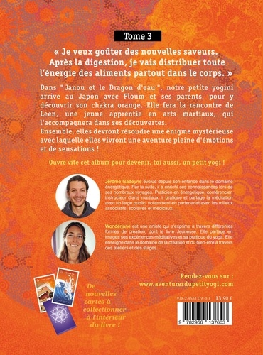 " Je veux goûter des nouvelles saveurs. Après la digestion, je vais distribuer toute l'énergie des aliments partout dans le corps. " Dans " Janou et le Dragon d'eau ", notre petite yogini arrive au Japon avec Ploum et ses parents, pour y découvrir son chakra orange. Elle fera la rencontre de Leen, une jeune apprentie en arts martiaux, qui l'accompagnera dans ses découvertes. Ensemble, elles devront résoudre une énigme mystérieuse avec laquelle elles vivront une aventure pleine d'émotions et de sensations ! Ouvre vite cet album pour devenir, toi aussi, un petit yogi ! " Cartes à collectionner à l'intérieur du livre. (Cartes chakra, sens, son, élément, expériences). "