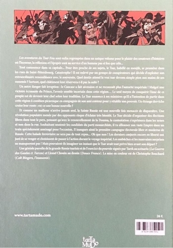 Les aventures du Tsar Fou sont enfin regroupées dans un unique volume pour le plaisir des amateurs d'histoires où l'humour, la réflexion et l'épopée sont au service d'un homme pas si fou que cela... Tout commence dans sa capitale... Pour être proche de ses sujets, le Tsar, habillé en moujik, se promène dans les rues de Saint-Pétersbourg. Catastrophe ! Il est enlevé par un groupe de conspirateurs qui décide d'exploiter son extraordinaire ressemblance avec le souverain. Quel destin attend le vrai tsar devenu simple pion aux mains de ses ennemis ? Surtout, quel châtiment leur réservera-t-il par la suite ? Un autre danger fait irruption : le Caucase a fait sécession et ne reconnait plus l'autorité impériale ! Malgré une victoire écrasante du Prince, l'avenir semble incertain dans cette région... Le seul moyen de conquérir l'âme de ce peuple est de devenir leur chef selon leur tradition. Le Tsar annonce à ses ministres qu'il a l'intention de partir dans cette région ô combien picaresque en compagnie de son ami conteur pour y rétablir son pouvoir. Un étrange derviche croise leur route : est-ce une bonne nouvelle ? Et comme un malheur n'arrive jamais seul, la Sainte Russie est une nouvelle fois menacée de disparaître. Une révolution populaire menée par des opposants risque d'éclater très bientôt. Le Tsar décide d'organiser des élections libres dans tout le pays, pensant qu'avec le renouvellement de la Douma, la contestation s'exprimera dans les urnes et non dans la rue. Souhaitant soutenir les candidats du parti monarchiste, il va sillonner son vaste Empire dans un train spécialement aménagé pour l'occasion. Il inaugure ainsi la première campagne électorale libre et moderne de Russie. Cette balade ferroviaire ne sera pas de tout repos... Oh que non ! Les derniers conjurés encore en liberté ont juré de se venger et choisissent de passer à l'action durant le voyage impérial. Les embûches et les mauvaises surprises ne manqueront pas ! Mais pouvaient-ils imaginer un instant que le Tsar avait tout prévu bien avant son départ ? Une géniale parodie de la grande Russie tsariste et de l'exercice du pouvoir signée par Tarek au scénario (La Guerre des Gaules et Turcos) et Lionel Chouin au dessin (Douce France). La mise en couleur est de Christophe Bouchard (ColtBingers, l'insoumis).