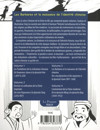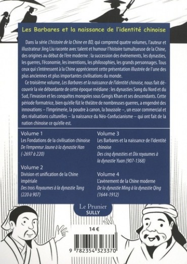 Dans la série L'histoire de la Chine en BD, qui comprend quatre volumes, l'auteur et illustrateur Jing Liu raconte avec talent et humour l'histoire tumultueuse de la Chine, des origines au début de l'ère moderne : la succession des événements, les dynasties, les guerres, l'économie, les inventions, les philosophies, les grands personnages. Tous ceux qui s'intéressent à la Chine apprécieront cette présentation illustrée de l'une des plus anciennes et plus importantes civilisations du monde. Ce troisième volume, Les Barbares et la naissance de L4identité chinoise, nous fait découvrir la vie débordante de cette époque médiane : les dynasties Song du Nord et du Sud, l'invasion et les conquêtes mongoles sous Gengis Khan et ses descendants. Cette période formatrice, bien qu'elle fût le théâtre de nombreuses guerres, a engendré des innovations — l'imprimerie, la poudre à canon, la boussole —, un essor commercial et des réalisations culturelles — la naissance du Néo-Confucianisme — qui ont fait de la nation chinoise ce qu'elle est.