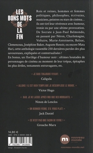 Empereurs, rois et reines, hommes et femmes politiques, philosophes, écrivains, musiciens, peintres ou stars de cinéma, de nombreux personnages qui ont marqué l'Histoire ont tiré leur révérence avec humour, panache, philosophie ou par une ultime provocation. De Socrate à Jean-Paul Belmondo, en passant par Néron, Charlemagne, Léonard de Vinci, Voltaire, Marie-Antoinette, Honoré de Balzac, Georges Clémenceau, Auguste Renoir, Joséphine Baker ou encore Pierre Desproges, cette anthologie rassemble - et décortique - 300 façons aussi uniques que savoureuses de tirer sa révérence ! Avec en bonus : un florilège des dernières paroles de personnages de fiction illustres passés de vie à trépas dans les romans, films, séries... Une anthologie classée de manière thématique pour découvrir les dernières paroles drôles, surprenantes ou touchantes, mais toujours bien réelles , de 300 personnages célèbres. Des ultimes déclarations sourcées et expliquées qui sont autant des témoignages sur la sincérité de leur auteur face à la mort que de réjouissants hommages à la vie. "Tirez le rideau, la farce est jouée ! " Rabelais "Docteur, je meurs au-dessus de mes moyens ! " , Oscar Wilde "J'emmerde la mort" , Marlon Brando "Les dernières paroles sont pour les imbéciles qui n'en ont pas dit assez". , Karl Marx Journaliste et éditeur, Gilles Bouley-Franchitti est l'auteur de plusieurs livres d'humour dont Le Petit Coluche illustré par l'exemple (Nouveau Monde éditions, 2016).