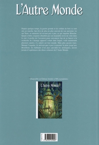 Depuis quelque temps, la guerre gronde et les soldats de bois se sont mis en marche. Jan rêve de plus en plus souvent de son ancienne vie sur Terre. sa mémoire lui revient peu à peu, ce qui inquiète Blanche. Quant à Abler, toujours obnubilé par son insatiable envie de voler dans le ciel, il profite de l'occasion pour convaincre Jan de se lancer à la recherche de l'étrange appareil volant dans lequel, voilà maintenant plusieurs années, il a atterri sur leur monde. Mais plus aucune trace. Menant l'enquête, ils arrivent peu à peu à remonter la piste jusqu'aux Brouillons. les habitants d'un pays par-delà les montagnes, ancien terrain d'expériences des dieux créateurs de l'Autre Monde.