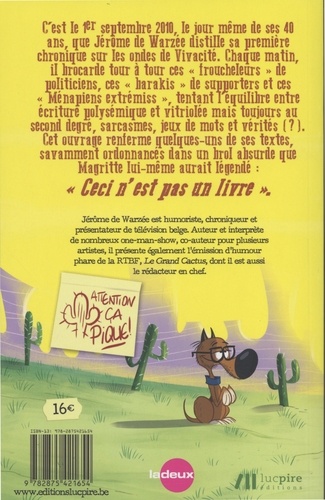 C'est le 1er septembre 2010, le jour même de ses 40 ans, que Jérôme de Warzée distille sa première chronique sur les ondes de Vivacité. Chaque matin, il brocarde tour à tour ces " froucheleurs " de politiciens, ces " harakis " de supporters et ces " Ménapiens extremiss ", tentant l'équilibre entre écriture polysémique et vitriolée mais toujours au second degré, sarcasmes, jeux de mots et vérités (? ). Cet ouvrage renferme quelques-uns de ses textes, savamment ordonnances dans un brol absurde que Magritte lui-même aurait légendé : " Ceci n'est pas un livre ".