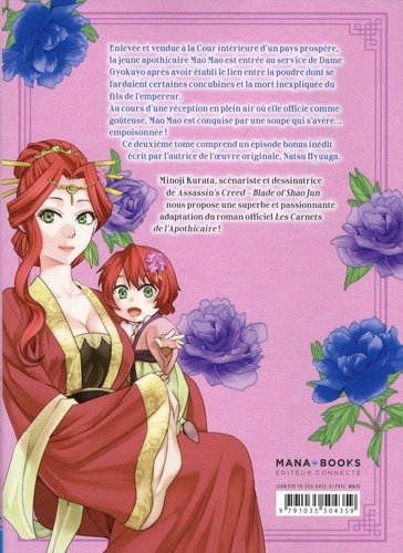 La curiosité n'est pas toujours un vilain défaut... Enlevée et vendue à la Cour intérieure d'un pays prospère, la jeune apothicaire Mao Mao est entrée au service de Dame Gyokuyo après avoir établi le lien entre la poudre dont se fardaient certaines concubines et la mort inexpliquée du fils de l'empereur. Au cours d'une réception en plein air où elle officie comme goûteuse, Mao Mao est conquise par une soupe qui s'avère... être empoisonnée ! Ce deuxième tome comprend un épisode bonus inédit écrit par l'auteur de l'oeuvre originale, Natsu Hyuuga.