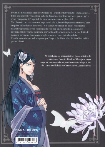 La curiosité n'est pas toujours un vilain défaut... Les sublimes ambassadrices venues de l'Ouest ont demandé l'impossible... Elles souhaitent rencontrer la belle danseuse que leur arrière-grand-père avait comparée à l'esprit de la lune un demi-siècle plus tôt ! Mao Mao découvre comment reproduire la scène de l'époque au terme d'une enquête minutieuse. Pour cela, elle compte utiliser un atout redoutable ! La jeune apothicaire se voit ensuite confier une nouvelle mission. En préparant un remède pour une servante, elle se retrouve liée à une lutte de pouvoir aux ramifications complexes dans l'enceinte du palais. C'est là autant d'occasions pour que l'esprit de déduction de Mao Mao brille par sa clarté !