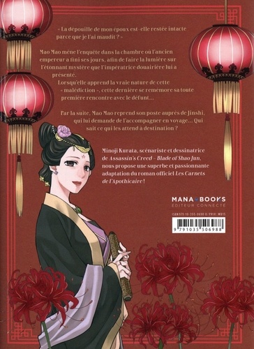 "La dépouille de mon époux est-elle restée intacte parce que je l'ai maudit ? " Mao Mao mène l'enquête dans la chambre où l'ancien empereur a fini ses jours, afin de faire la lumiere sur l'étonnant mystère que l'impératrice douairière lui a présenté. Lorsqu'elle apprend la vraie nature de cette "malédiction", cette dernière se remémore sa toute première rencontre avec le défunt... Par la suite, Mao Mao reprend son poste auprès de Jinshi, qui lui demande de l'accompagner en voyage... Qui sait ce qui les attend à destination ? Minoji Kurata, scénariste et dessinatrice de "Assassin's Creed - Blade of Shao Jun", nous propose une superbe et passionnante adaptation du roman officiel "Les Carnets de l'Apothicaire" !