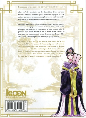 Intrigues et poisons au coeur du palais impérial ! Alors qu'elle enquêtait sur la disparition d'une servante malade, Mao Mao découvre que la dame de compagnie de Lifa, qui est également sa cousine, complotait pour espérer prendre sa place ! Une manigance aux très lourdes conséquences... Peu après, l'empereur en personne demande à la jeune apothicaire de l'accompagner au temple du choix, dans lequel il faut résoudre une énigme et emprunter le bon passage afin de prouver son statut d'héritier de la reine mère. Hélas, le souverain ne parvient pas à percer le secret des lieux... Mao Mao saura-t-elle comprendre le message qui s'y cache ? Découvrez la face cachée du lieu le plus secret de la cité impériale ! Dans ce monde de femmes régi par les hommes, Mao Mao aura besoin de toute son intelligence et de tout son savoir pour démêler les intrigues de la cour... Avec son héroi ? ne hors norme et ses décors magnifiques, ce manga événement adapté d'un roman à succès a tout pour plaire ! Et vous, aurez-vous le courage de gou^ter à ses délices ?