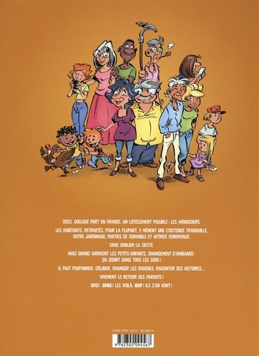 Bienvenue aux Arbousiers ! Les habitants - retraités, pour la plupart - y mènent une existence tranquille, entre jardinage, parties de scrabble et apéros conviviaux. Sans oublier la sieste. Mais quand arrivent les petits-enfants, changement d'ambiance : ça court dans tous les sens ! Il faut pouponner, câliner, changer les couches, raconter des histoires, ... Vivement le retour des parents !