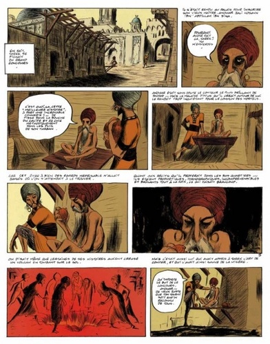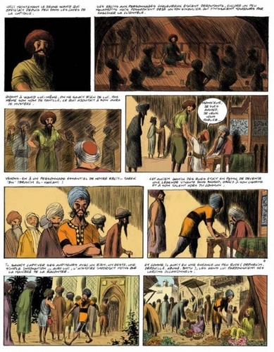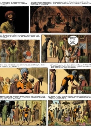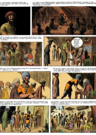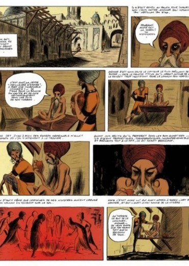 " Approchez donc. je sais que vous êtes ici pour entendre une histoire. Une histoire que certains d'entre vous ont dit quelle était drôle, touchante, pleine de fureur... Tandis que d'autres vous ont assuré qu'elle ne valait pas grand chose. Qui croire alors?.. Vous avez bien fait de venir me voir. Je connais mieux que quinconque la terrible et édifiante histoire des Cinq Conteurs de Bagdad. Car j'étais l'un d'entre eux... Vous êtes prêt à entendre mon récit?.. Alors laissez-vous guider par ma parole. "