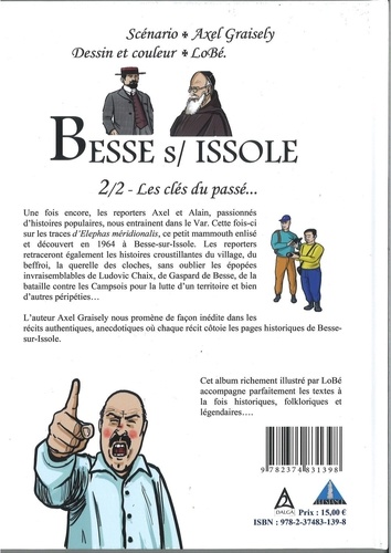 Une fois encore, les reporters Axel et Alain, passionnés d'histoires populaires, nous entrainent dans le Var. Cette fois-ci sur les traces d'Elephas méridionalis, ce petit mammouth enlisé et découvert en 1964 à Besse-sur-lssole. Les reporters retraceront également les histoires croustillantes du village, du beffroi, la querelle des cloches, sans oublier les épopées invraisemblables de Ludovic Chaix, de Gaspard de Besse, de la bataille contre les Campsois pour la lutte d'un territoire et bien d'autres péripéties... L'auteur Axel Graisely nous promène de façon inédite dans les récits authentiques, anecdotiques où chaque récit côtoie les pages historiques de Besse- sur-Issole. Cet album richement illustré par LoBé accompagne parfaitement les textes à la fois historiques, folkloriques et légendaires...