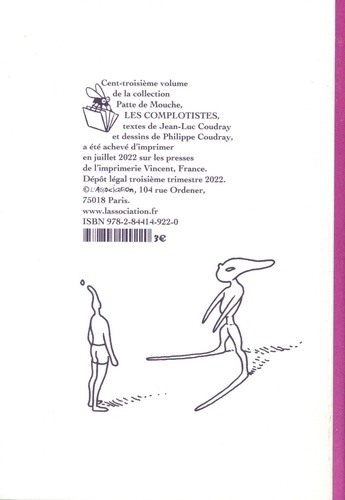 Cent-troisième volume de la collection Wb, Patte de Mouche, Les complotistes, textes de Jean-Luc Coudray et dessins de Philippe Coudray, a été achevé d'imprimer en juillet 2022 sur les presses de l'imprimerie Vincent, France. Dépôt légal troisième trimestre 2022.