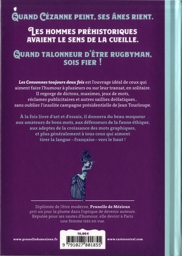 Les Consonnes toujours deux fois est l'ouvrage idéal de ceux qui aiment faire l'humour à plusieurs ou sur leur transat, en solitaire. Il regorge de dictons, maximes, jeux de mots, réclames publicitaires et autres saillies drôlatiques... sans oublier l'insolite campagne présidentielle de Jean Tourloupe. A la fois livre d'art et d'essais, il donnera du beau moqueur aux amateurs de bons mots, aux défenseurs de la faune éthique, aux adeptes de la croissance des mots graphiques, et plus généralement à tous ceux qui aiment tirer la langue -française- vers le haut !