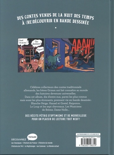 Célèbres collecteurs des contes traditionnels allemands, les frères Grimm ont fait connaitre au monde des histoires devenues universelles. Dans cet album, dix d'entre eux, parmi les plus connus mais aussi les plus étonnants, prennent vie en bande dessinée : Blanche-Neige, Hansel et Gretel, Raiponce, Le Loup et les sept chevreaux, Les Musiciens de Brème, Dame Holle... Des récits pétris d'optimisme et de merveilleux pour un plaisir de lecture tout neuf !