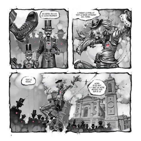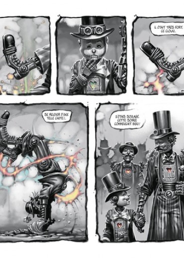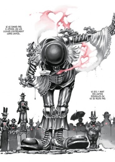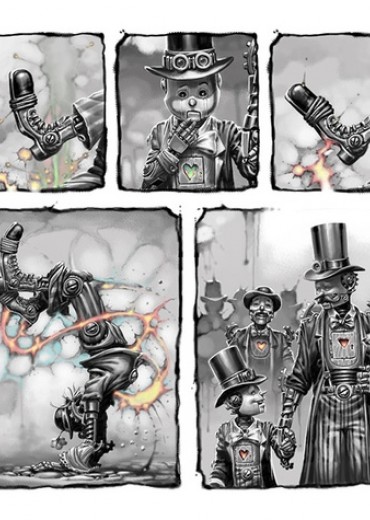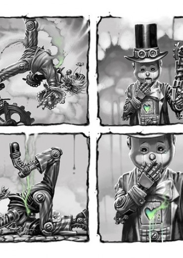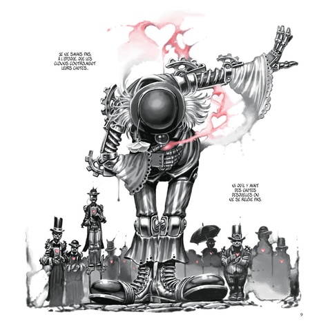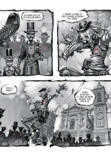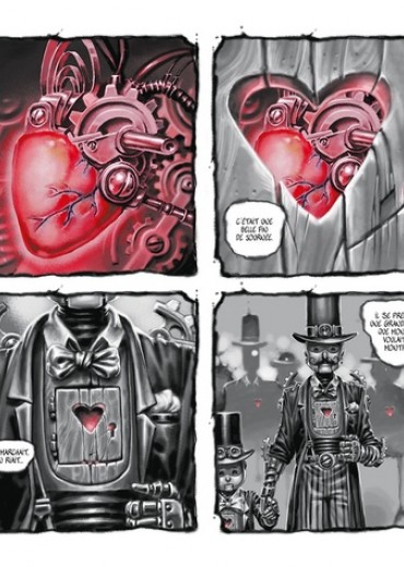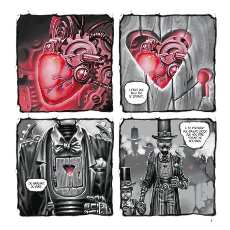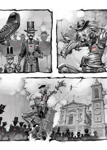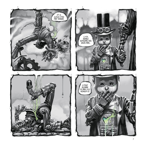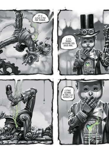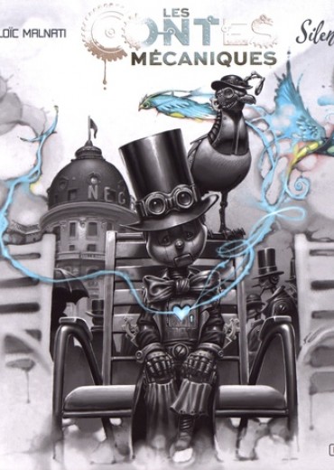 SILENCE, premier Conte Mécanique, évoque l'attentat de la promenade des anglais à Nice, sans violence, mettant en scène une métaphore de cet évènement tragique, et la guérison d'un enfant au coeur blessé. C'est une histoire sur la résillience et la nécessité de toujours rester en contact avec son coeur et la beauté du monde. Les récits steampunks de Loïc Malnati sont volontairement naîfs et simples pour permettre à l'émotion de chaque image de guider la lecture. Les pantins sont des personnages qui vivent dans un monde au passé, en noir et blanc. Tout comme nous, ils ont le sentiment de ne pas maîtriser leurs vies... mais ils ont des rêves, ils aiment, ils créent, et leursémotions génèrent de la couleur.