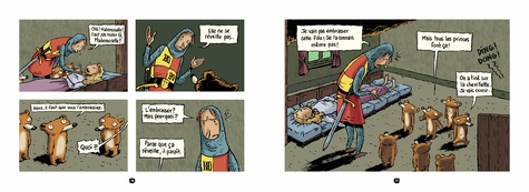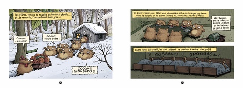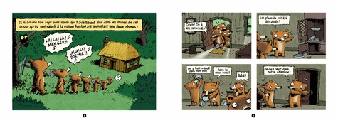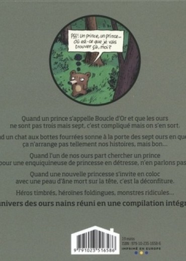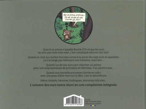 C'est l'histoire de 7 ours qui vivaient dans la forêt et qui allaient croiser, tour à tour, tous les personnages des contes de fées... Parues entre 2004 et 2012, les quatre aventures de nos chers ours nains sont réunies pour la première fois en une compilation intégrale. Cet ouvrage comprend : Boucle d'or et les sept ours nains : où les ours nains découvrent une jolie géante endormie dans leurs lits et mettent tout en oeuvre pour la déloger. Avec les guests suivants : Boucle d'or, le vaillant petit tailleur, le joueur de flûte de Hamelin, La Faim des sept ours nains : où les ours nains, souffrant de la faim par un hiver glacé, décident d'abandonner l'un des leurs dans la forêt . Guests : le petit chaperon rouge, le chat botté, Hansel et Gretel, le loup, (et même le haricot magique). La Belle aux ours nains : où les ours nains sont obligés d'héberger Blanche-Neige fuyant sa marâtre et en quête de son prince. Guests : Cendrillon, la Bonne Fée, la Bête, le Prince Charmant, les trois petits cochons. Qui veut la peau des sept ours nains ? cette fois c'est Peau d'Ane qui s'invite chez les ours, et elle ne compte pas partir de sitôt. Nos ours n'en peuvent plus des colocations et ils sont au bout du rouleau. Serait il temps de revenir à la vie sauvage ? Les guests : les Musiciens de Brême, Jean de l'Ours, le Diable lui-même, le loup (encore ! ).