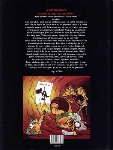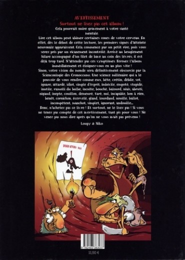 Avertissement. Surtout ne lisez pas cet album ! Cela pourrait nuire gravement à votre santé mentale. Lire cet album peut abîmer certaines zones de votre cerveau. En effet, dès le début de cette lecture, les premiers signes d'atteinte neuronale apparaissent. Cela commence par un petit rire, puis vous serez pris par un ricanement incontrôlé. Arrivé au beuglement hilare accompagné d'un filet de bave au coin des lèvres, il est déjà trop tard. N'attendez pas ces symptômes. Fermez l'album immédiatement et éloignez-vous en au plus vite ! Sinon, votre vision du monde sera définitivement obscurcie par la Scienconlogie des Cronoccums. Une science millénaire qui a le pouvoir de vous rendre comme eux, bête, crétin, débile, sot, ignare, attardé, idiot, simple d'esprit, imbécile, empoté, stupide, inutile, ramolli du bulbe, inculte, bouché, balourd, niais, abruti, nigaud, inepte, couillon, demeuré, taré, nul, incapable, bon à rien, benêt, cornichon, écervelé, gland, lourdaud, nouille, ballot, incompétent, manchot, simplet, ignorant, andouille." Donc, n'achetez pas ce livre ! Et surtout, ne le lisez pas ! Si vous ne tenez pas compte de cet avertissement, tant pis pour vous ! Ne venez pas nous dire après qu'on ne vous avait pas prévenu !