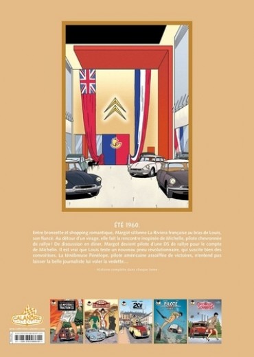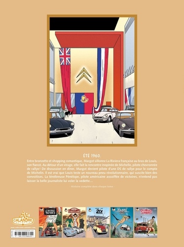Ete 1960. Entre bronzette et shopping romantique, Margot sillonne La Riviera française au bras de Louis, son fiancé. Au détour d'un virage, elle fait la rencontre inopinée de Michelle, pilote chevronnée de rallye ! De discussion en dîner, Margot devient pilote d'une DS de rallye pour le compte de Michelin. Il est vrai que Louis teste un nouveau pneu révolutionnaire, qui suscite bien des convoitises. La ténébreuse Pénélope, pilote américaine assoiffée de victoires, n'entend pas laisser la belle journaliste lui voler la vedette...
