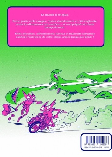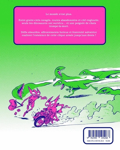 Le monde nest plus. Entre gratte-ciels ravagés, routes détruites et cités abandonnées, seuls les dinosaures ont survécus... et une poignée de chats trompe-la-mort. Défis stupides, affrontements furieux et fraternité salvatrice exaltent lexistence de cette clique armée jusquaux dents ! Prix Claus Deleuran 2017 de la meilleure couleur.
