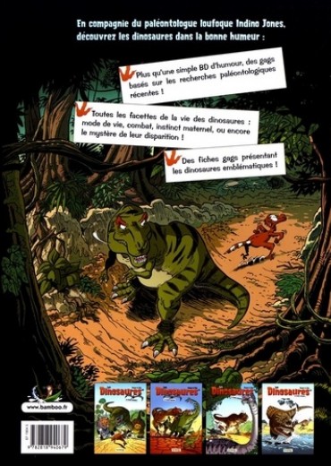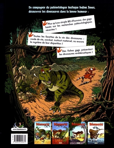 Combien de temps vivaient les dinosaures ? Comment s'occupaient-ils de leurs petits ? Qui était le Carnotaurus, ce terrifiant "taureau carnivore" ? Le paléontologue loufoque Indino Jones répond à toutes les questions que vous vous posez sur ces fascinantes créatures. Retrouvez vos dinos préférés : le cruel Tyrannosaurus rex, le farouche Triceratops, le gigantesque Diplodocus ou le minuscule (et teigneux) Compsognathus... Mais aussi de nombreuses nouvelles espèces aux caractéristiques surprenantes. Alors, enfilez votre sac à dos et en route pour observer les créatures les plus drôles que la Terre ait connues ! Cette édition est enrichie d'un cahier de 6 pages sur le T. rex et son environnement.