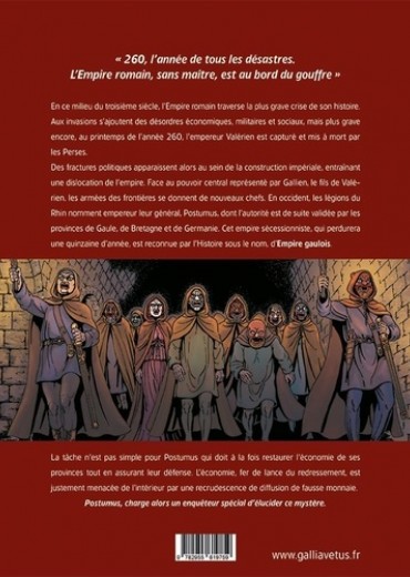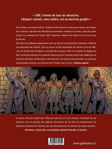 260, l'année de tous les désastres. En ce milieu du troisième siècle, l'Empire romain traverse la plus grave crise de son histoire. Aux invasions s'ajoutent des désordres économiques, militaires et sociaux, mais plus grave encore, au printemps de l'année 260, l'empereur Valérien est capturé et mis à mort par les Perses. Des fractures politiques apparaissent alors au sein de la construction impériale, entraînant une dislocation de l'empire. En occident, les légions du Rhin nomment empereur leur général, Postumus, dont l'autorité est de suite validée par des provinces. Cet empire sécessionniste, qui perdurera quinze années, est reconnue par l'Histoire sous le nom, d' Empire gaulois. La tâche n'est pas simple pour Postumus qui doit à la fois restaurer l'économie de ses provinces tout en assurant leur défense. L'économie, fer de lance du redressement, est menacée de l'intérieur par une recrudescence de fausse monnaie. Postumus, charge alors un enquêteur spécial d'élucider ce mystère.