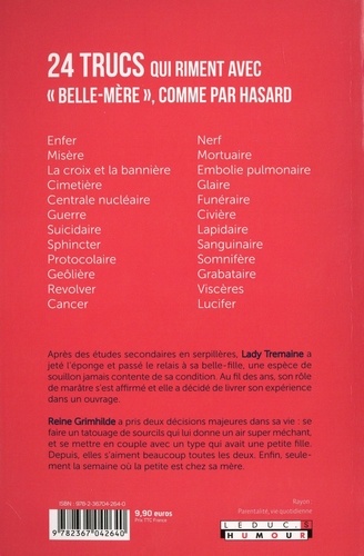 24 trucs qui riment avec "belle-mère ", comme par hasard : Enfer, Misère, La croix et la bannière, Cimetière, Centrale nucléaire, Guerre, Suicidaire, Sphincter, Protocolaire, Geôlière, Revolver Nerf, Mortuaire, Embolie pulmonaire, Glaire, Funéraire, Civière, Lapidaire, Sanguinaire, Somnifère, Grabataire, Viscères, Lucifer.