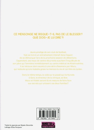 Ce mensonge ne risque-t-il pas de le blesser ? que dois-je lui dire ? ! Jeune prodige de son club de football, Yuki se livre à un entraînement intensif dans l'espoir de se démarquer lors de la prochaine session de détections. Cependant, ses maux de ventre récurrents suscitent l'inquiétude de son père qui l'emmène immédiatement au centre médical de Kitahiroshima. Il se retrouve alors soumis à une série d'examens par Maco, qui redoute qu'une maladie grave ne menace la vie et carrière du lycéen. Dans le même temps, le voile sur le passé qui lie Kuroda à Goro, le directeur de la clinique, se lève. Maco et Hideki seront-ils en mesure de foire face aux secrets qui unissent ces deux familles ?