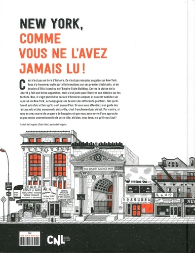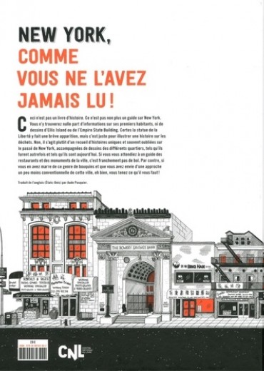 Ceci n'est pas un livre d'histoire. Ce n'est pas non plus un guide sur New York. Vous n'y trouverez nulle part d'informations sur ses premiers habitants, ni de dessins d'Ellis Island ou de l'Empire State Building. Certes la statue de la Liberté y fait une brève apparition, mais c'est juste pour illustrer une histoire sur les déchets. Non, il s'agit plutôt d'un recueil d'histoires uniques et souvent oubliées sur le passé de New York, accompagnées de dessins des différents quartiers, tels qu'ils furent autrefois et tels qu'ils sont aujourd'hui. Si vous vous attendiez à un guide des restaurants et des monuments de la ville, c'est franchement pas de bol. Par contre, si nous en avez marre de ce genre de bouquins et que vous avez envie d'une approche un peu moins conventionnelle de cette ville, eh bien, vous tenez ce qu'il vous faut !