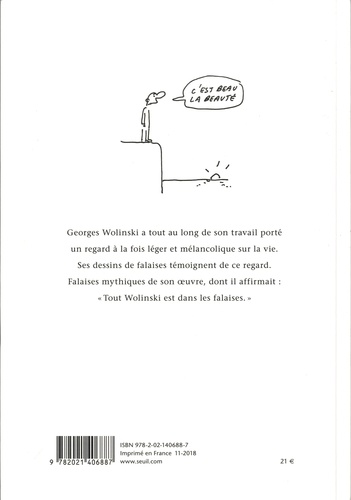 Georges Wolinski a tout au long de son travail porté un regard à la fois léger et mélancolique sur la vie. Ses dessins de falaises témoignent de ce regard. Falaises mythiques de son oeuvre dont il affirmait : "Tout Wolinski est dans les falaises". Dessinateur de renom, caricaturiste contestataire, Georges Wolinski a croqué l'actualité pour Libération , Le Nouvel Observateur , Hara Kiri , Charlie-Hebdo . Plusieurs fois récompensé pour sa plume acérée, il a collaboré avec de grands noms, comme Cabu. Georges Wolinski, assassiné le 7 janvier 2015, était aussi un fin prosateur.
