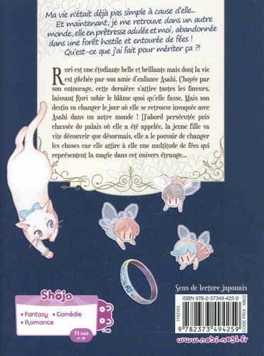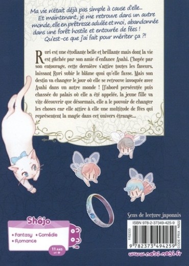 Ma vie n'était déjà pas simple à cause d'elle... Et maintenant, je me retrouve dans un autre monde, elle en prêtresse adulée et moi, abandonnée dans une forêt l'hostile et entourée de fées ! Qu'est-ce que j'ai fait pour mériter ça ? ! Ruri est une étudiante belle et brillante mais dont la vie est gâchée par son amie d'enfance Asahi. Choyée par son entourage, cette dernière s'attire toutes les faveurs, laissant Ruri subir le blâme quoi qu'elle fasse. Mais son destin va changer le jour où elle se retrouve invoquée avec Asahi dans un autre monde ! D'abord persécutée puis chassée du palais où elle a été appelée, la jeune fille va vite découvrir que désormais, elle a le pouvoir de changer les choses car elle attire à elle une multitude de fées qui représentent la magie dans cet univers étrange...
