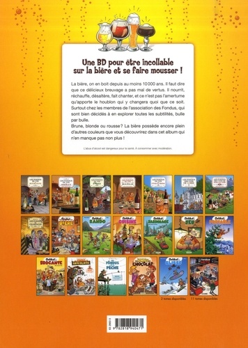 Une BD pour être incollable sur la bière et se faire mousser ! La bière, on en boit depuis au moins 10 000 ans. Il faut dire que ce délicieux breuvage a pas mal de vertus si on le consomme avec modération. La bière nourrit, réchauffe, désaltère, fait chanter, et ce n'est pas l'amertume qu'apporte le houblon qui y changera quoi que ce soit. Surtout chez les membres de l'association des Fondus, qui sont bien décidés à en explorer toutes les subtilités, bulle par bulle. Car ce qui fait le charme de la bière, c'est aussi son côté féminin. N'est-elle pas tantôt brune, tantôt blonde ou tantôt rousse ? Et encore pleins d'autres couleurs que vous découvrirez dans cet album qui n'en manque pas !