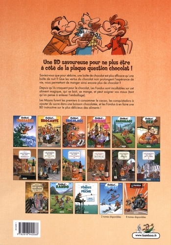 Une BD savoureuse pour ne plus être à côté de la plaque question chocolat ! Saviez-vous que pour séduire, une boîte de chocolat est plus efficace qu'une boîte de nuit ? Que les vertus du chocolat noir prolongent l'espérance de vie, vous permettant de manger ainsi encore plus de chocolat ? Depuis qu'ils craquent pour le chocolat, les Fondus sont incollables sur cet aliment magique, qui se boit, se mange, et peut soigner vos maux (tant qu'on pense à enlever l'emballage avant). Les Mayas furent les premiers à consommer le cacao, les conquistadors à y ajouter du sucre dans une boisson chocolatée, et les Fondus à en faire une BD instructive sur le plus délicieux des aliments !