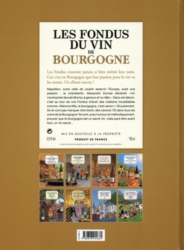 Les Fondus n'auront jamais si bien mérité leur nom. Car c'est en Bourgogne que leur passion pour le vin va les mener. Un album nectar ! Napoléon, outre celle de vouloir asservir l'Europe, avait une passion : le chambertin. Alexandre Dumas déclarait "Un montrachet devrait être bu à genoux et nu-tête". Dans cet album, c'est au tour de nos Fondus d'avoir des citations Inoubliables comme "Mamma Mia, le bourgogne, c'est canon ! " Et justement, ils ne vont pas manquer d'en boire, des canons ! Et dans tous les coins de la Bourgogne ! Ils vont, avec humour et méthodiquement, prouver que le bourgogne est un sacré vin, mais peut-être avant tout, un vin sacré...