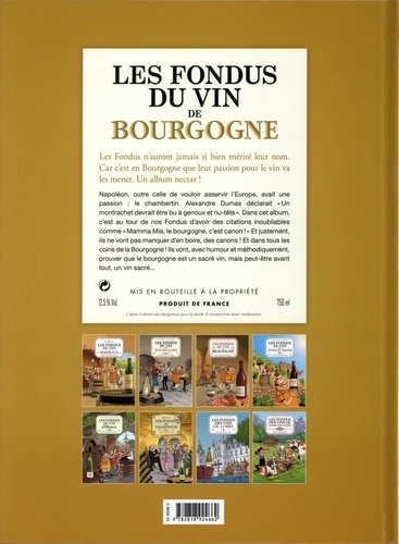 Les Fondus n'auront jamais si bien mérité leur nom. Car c'est en Bourgogne que leur passion pour le vin va les mener. Un album nectar ! Napoléon, outre celle de vouloir asservir l'Europe, avait une passion : le Gevrey-Chambertin. Alexandre Dumas déclarait "Un Montrachet devrait être bu à genoux et nu-tête". Dans cet album, c'est au tour de nos Fondus d'avoir des citations inoubliables comme "Mamma Mia, le Bourgogne c'est canon ! " Et justement, ils ne vont pas manquer d'en boire des canons ! Et dans tous les coins de la Bourgogne ! Ils vont avec humour et méthodiquement prouver que le Bourgogne c'est un sacré vin, mais peut-être avant tout, un vin sacré...
