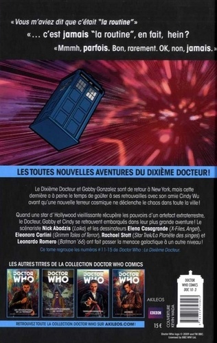 Le Dixième Docteur et Gabby Gonzalez sont de retour à New York, mais cette dernière a à peine le temps de goûter à ses retrouvailles avec son amie Cindy Wu avant qu'une nouvelle terreur cosmique ne déclenche le chaos dans toute la ville ! Quand une star d'Hollywood vieillissante récupère les pouvoirs d'un artefact extraterrestre, le Docteur, Gabby et Cindy se retrouvent embarqués dans leur plus grande aventure ! Le scénariste Nick Abadzis (Laika) et les dessinateurs Elena Casagrande (X-Files, Angel), Eleonora Carlini (Grimm Tales of Terror), Rachael Stott (Star Trek/La Planète des singes) et Leonardo Romero (Batman '66) ont fait passer la menace galactique à un autre niveau !