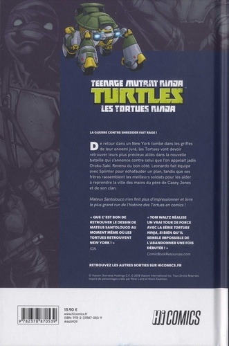 La guerre comme Shredder fait rage ! De retour dans un New York tombé dans les griffes de leur ennemi juré, les Tortues vont devoir retrouver leurs plus précieux alliés dans la nouvelle bataille qui s'annonce contre celui que l'on appelait jadis Oroku Saki. Revenu du bon coté, Leonardo fait équipe avec Splinter pour échafauder un plan, tandis que ses frères rassemblent les meilleurs soldats pour les aider à reprendre la ville des mains du père de Casey Jones et de son clan. Mateus Santolouco n'en finit plus d'impressionner et livre le plus grand run de l'histoire des Tortues en comics !