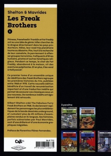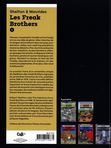Phineas, Freewheelin' Franklin et Fat Freddy ont eu une idée de génie ! Aller chercher de la drogue directement dans les pays producteurs. Hélas, leur road trip planétaire tourne au désastre. Pire, tout à la recherche de leur camelote, ils parviennent à offenser groupes terroristes, trafiquants d'êtres humains, pirates et autres fanatiques religieux. Pendant ce temps, le chat de Fat Freddy, abandonné à la maison, vit des aventures palpitantes. Et en plus, il les vend à Hollywood ! Ce premier tome d'un ensemble unique de rééditions des Freak Brothers regroupe les premières histoires du trio, publiées entre 1968 et 1972. Cette nouvelle édition bénéficie d'un travail de renumérisation important et d'une traduction inédite qui permet de savourer ces classiques sous un jour nouveau. De nombreux inédits ont également été retrouvés. Gilbert Shelton créé The Fabulous Furry Freak Brothers en 1968. Ils deviennent rapidement les personnages les plus emblématiques de la bande dessinée underground, et cumulent plus de 45 millions d'exemplaires vendus en 16 langues. Ses histoires, parfois scénarisées par Paul Mavrides, sont d'une drôlerie et d'une économie graphiques inégalées.