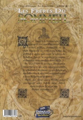 Que se passe-t-il lorsqu'une étrange fraternité d'hommes d'armes, riches, puissants et de plus masqués, se met dans l'idée de défendre coûte que coûte le secret de Nikobus Kéton, le mystérieux moine alchimiste venu du douzième siècle ? Et qu'advient-il lorsque Doménico, notre héros, et ses amis, qui ont retrouvé le testament du moine et son fabuleux médaillon Gorik, se retrouvent confrontés à cette dangereuse confrérie ? Qui sera assez hardi, assez courageux et assez habile pour défier ouvertement la terrible secte des "Frères du Sommeil" ? Voici le deuxième opus de cette trépidante et passionnante aventure initiée avec Le Secret de Nikobus Kéton. Un scénario fouillé, un dessin précis et dynamique, tout est réuni pour faire de cette série un succès !