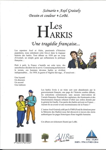 Les reporters Axel et Alain, passionnés d'histoires populaires, nous entraînent cette fois ci dans la tragique histoire des harkis. Tout débute en 1830 par un coup d'éventail, un simple geste qui enflammera la politique française ... Petit à petit, la France s'installe sur cette terre, des autochtones décident de la servir. Connaissant parfaitement le terrain, ces hommes devenus harkis se révèlent indispensables ... . En 1954, la guerre d'Algérie fait rage ... S'ensuivent : Une loyauté Un discours Un accord Une trahison Les harkis livrés à un triste sort sont abandonnés par le gouvernement français, une page de l'histoire sombre débute, les exécutions commencent, sans aucune intervention de l'armée française. Pourtant des capitaines, des lieutenants et des fonctionnaires français refusent d'obéir aux ordres donnés par le général de Gaulle. Une partie des harkis arrivent en France ... Auront-ils un avenir et une reconnaissance de la France ? L'auteur Axel Graisely aidé par le FMH (Fond de dotations pour la Mémoire des Harkis) nous fait découvrir à travers des récits authentiques les pages historiques d'une tragédie humaine. Cet album est richement illustré par Lobé.