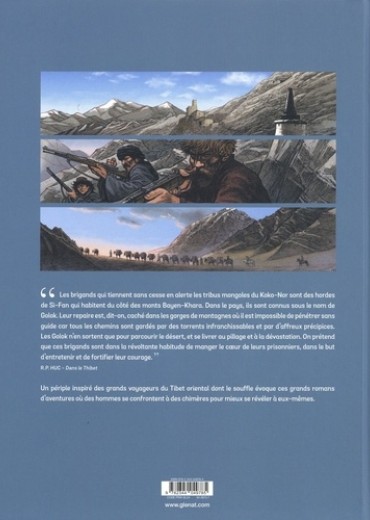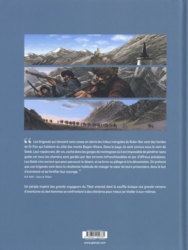 "Les brigands qui tiennent sans cesse en alerte les tribus mongoles du Koko-Nor sont des hordes de Si-Fan qui habitent du côté des monts Bugen-Khara. Dans le pays, ils sont connus sous le nom de Golok. Leur repaire est, dit-on, caché dans les gorges de montagnes où il est impossible de pénétrer sans guide car taus les chemins sont gardés par des torrents infranchissables et par d'affreux précipices. Les Golok n'en sortent que pour parcourir le désert, et se livrer au pillage et à la dévastation. On prétend que ces brigands sont dans la révoltante habitude de manger le coeur de leurs prisonniers, dans le but d'entretenir et de fortifier leur courage". R.G. HUC - Dans le Thibet. Un périple inspiré des grands voyageurs du Tibet oriental dont le souffle évoque ces grands romans d'aventures où des hommes se confrontent b des chimères pour mieux se révéler à eux-mêmes.