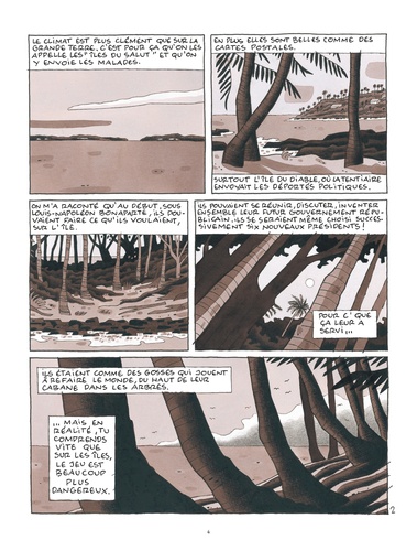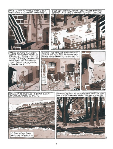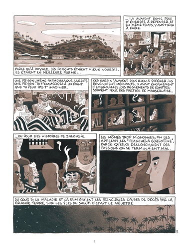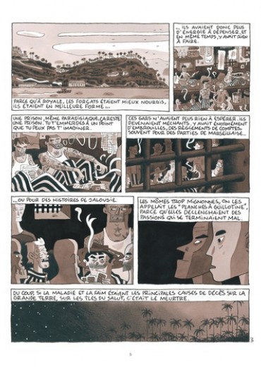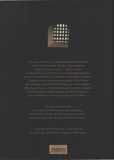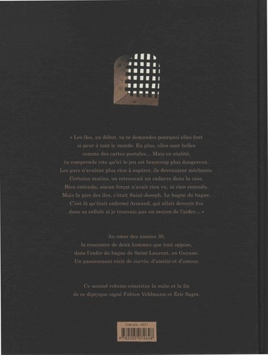 "Les îles, au début, tu te demandes pourquoi elles font si peur à tout le monde. En plus, elles sont belles comme des cartes postales... Mais en réalité, tu comprends vite qu'ici le jeu est beaucoup plus dangereux. Les gars n'avaient plus rien à espérer, ils devenaient méchants. Certains matins, on retrouvait un cadavre dans la case. Bien entendu, aucun forçat n'avait rien vu, ni rien entendu. Mais la pire des îles, c'était Saint-Joseph. Le bagne du bagne. C'est là qu'était enfermé Armand, qui allait devenir fou dans sa cellule si je trouvais pas un moyen de l'aider..." Au coeur des années 30, la rencontre de deux hommes que tout oppose, dans l'enfer du bagne de Saint-Laurent, en Guyane. Un passionnant récit de survie, d'amitié et d'amour. Ce second volume constitue la suite et la fin de ce diptyque signé Fabien Vehlmann et Eric Sagot.