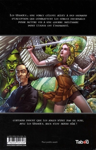 L'Enfer a gagné la lutte éternelle depuis longtemps et a pour ambition de diriger l'humanité tout entière. Avec Hellina à sa tête, le monde des Enfers se prépare à la domination finale. Les forces du Paradis n'ont pas d'autre choix que de venir contrer ces plans diaboliques. La plupart des guerriers saints des forces angéliques ont été éliminés ou vaincue. Seule Yael, une guerrière angélique, a survécu. C'est à elle qu'incombe le lourd fardeau de sauver l'humanité, aussi se met-elle en quête des plus impitoyables, rusées et vicieuses des créatures que le Ciel est engendré. Capables des pires sévices, elles formeront un groupe de résistantes appelées : "UNHOLY, les impies". Ecrit et dessiné par Christian Zanier (Banana Games), épaulé par Raulo Caceres (Légendes perverses) au dessin pour certaines histoires, cette compilation des cinq premiers épisodes parus aux USA en 2017, est un must pour les fans d'érotisme sexy et d'action fantastique.