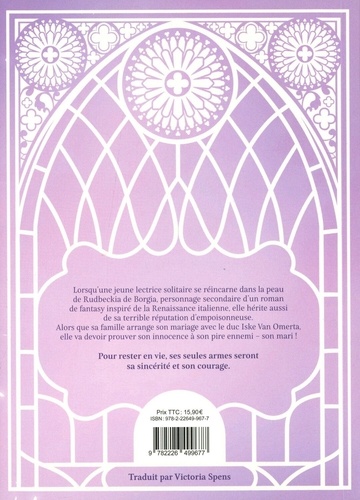 Lorsqu'une jeune lectrice solitaire se réincarne dans la peau de Rudbeckia de Borgia, personnage secondaire d'un roman de fantasy inspiré de la Renaissance italienne, elle hérite aussi de sa terrible réputation d'empoisonneuse. Alors que sa famille arrange son mariage avec le duc Iske Van Omerta, elle va devoir prouver son innocence à son pire ennemi - son mari ! Pour rester en vie, ses seules armes seront sa sincérité et son courage.
