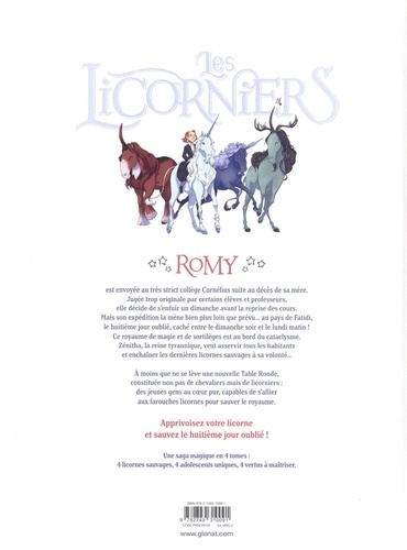 Entrez dans un monde magique où le temps s'est arrêté. Après le succès de Phobos, Victor Dixen revient avec une nouvelle série jeunesse inédite en bande dessinée qui remporte le Grand Prix des Lecteurs 2025 du Journal de Mickey ! Romy est envoyée au très strict collège Cornélius suite au décès de sa mère. Jugée trop originale par certains élèves et professeurs, elle décide de s'enfuir un dimanche avant la reprise des cours. Mais son expédition la mène bien plus loin que prévu... au pays de Fatidi, le huitième jour oublié, caché entre le dimanche soir et le lundi matin ! Ce royaume de magie et de sortilèges est au bord du cataclysme. Zénitha, la reine tyrannique, veut asservir tous les habitants et enchaîner les dernières licornes sauvages à sa volonté... A moins que ne se lève une nouvelle Table Ronde, constituée non pas de chevaliers mais de licorniers : des jeunes gens au coeur pur, capables de s'allier aux farouches licornes pour sauver le royaume. Apprivoisez votre licorne et sauvez le huitième jour oublié ! Une saga magique en 4 tomes : 4 licornes sauvages, 4 adolescents uniques, 4 vertus à maîtriser. Des contes de Grimm aux cycles arthuriens, cette histoire fantastique à la magie unique et au dessin soigné s'inspire des légendes du passé pour nous transporter hors du temps. C'est aussi un appel à nourrir la licorne que nous avons chacun au fond de nous, pour grandir avec courage, résilience et créativité.