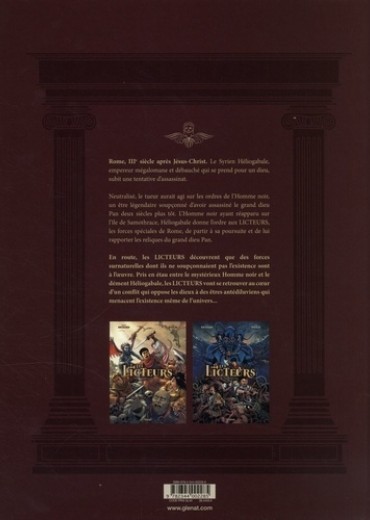 Quand Murena rencontre Lovecraft ! Rome, IIIe siècle après Jésus Christ. Le Syrien Héliogabale, empereur mégalomane qui se prend pour un dieu, subit une tentative d'assassinat. Neutralisé, le tueur aurait agi sur les ordres du légendaire Homme noir, responsable du meurtre du dieu Pan deux siècles auparavant. Pour en avoir le coeur net, Héliogabale charge alors une troupe d'élite de légionnaires romains, les Licteurs, d'enquêter et de lui rapporter les reliques de Pan. En prenant la route du sanctuaire de Samothrace où leur cible a été vue pour la dernière fois, les guerriers se confrontent à des forces surnaturelles terrifiantes qu'ils étaient loin d'imaginer. Et ce n'est pas tout : ils ignorent que derrière eux, à Rome, d'autres sombres puissances sont également à l'oeuvre... Entre la soif de puissance de l'Homme noir et la folie qui gagne peu à peu le coeur d'Héliogabale, les Licteurs vont se retrouver au coeur d'un conflit opposant les dieux eux-mêmes, duquel dépendra le destin de Rome et de l'univers tout entier. Entre aventure, mystères et combats épiques, plongez dans un péplum ésotérique où les forces occultes servent de métaphore à évoquer la Rome décadente. Les deux volumes, formant une histoire complète, paraîtront simultanément.